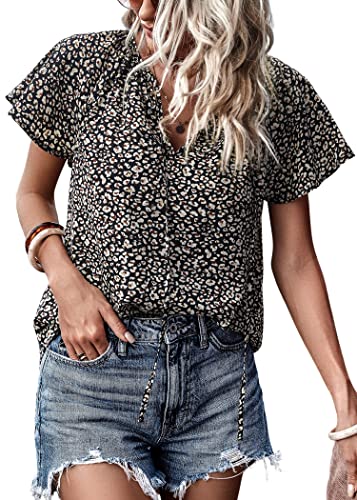 Embracing a delightful blend of style and comfort, this women’s summer top boasts a flattering v-neckline, adorned with captivating floral or leopard prints. The ruffle short sleeves add a touch of charm, while the loose-fitting design, accompanied by two strings, enhances its casual appeal.